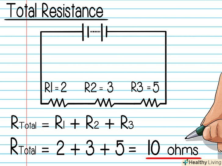 Спочатку розрахуємо загальний опір.складемо всі опору, включені в ланцюг. В результаті отримаємо загальний опір резисторів, з'єднаних послідовно.- Нехай три резистори R1, R2 і R3 мають опору2 Ома, 3 Ома і 5 Ом відповідно. Тоді загальний опір складе 2 + 3 + 5 = 10 Ом.