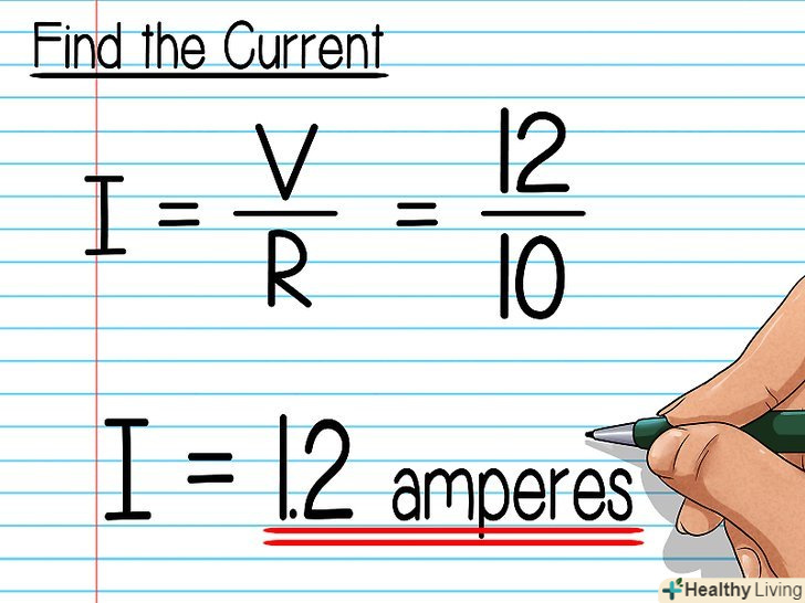 Знайдемо струм.використовуємо закон Ома для всього ланцюга. Як ми пам'ятаємо, при послідовному з'єднанні струм однаковий в будь-якій точці ланцюга. Тому досить один раз визначити струм і використовувати знайдену величину у всіх наступних розрахунках.- Відповідно до закону Ома, I = v / r. Напруга в ланцюзі становить 12 вольт, а загальний опір – 10 Ом. Звідси знаходимо I = 12/10 = 1,2 ампера.