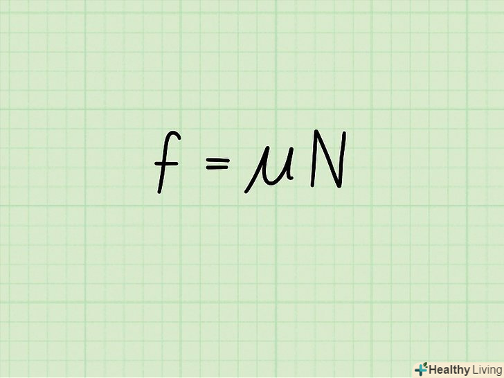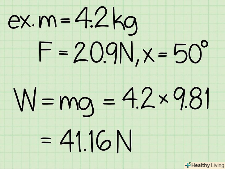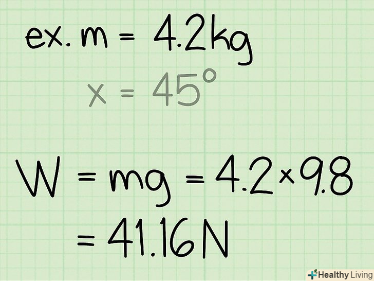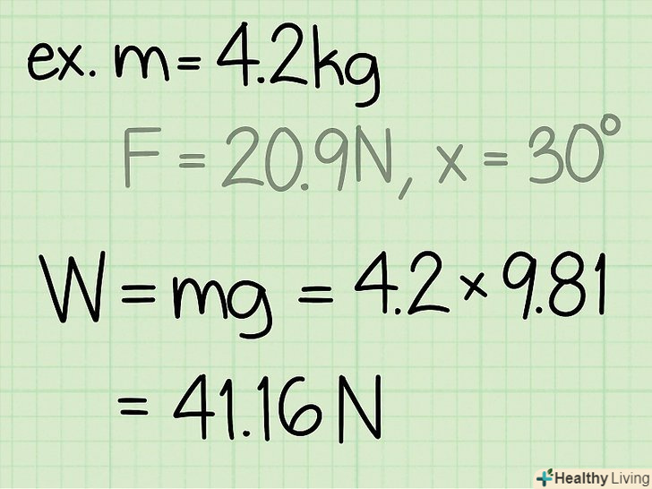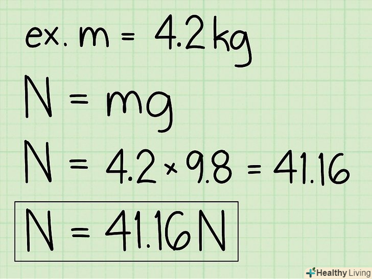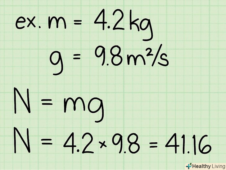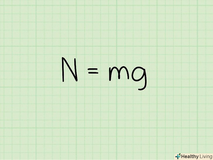 Помножте масу тіла на прискорення вільного падіння. ви знайдете вагу, який в даному випадку дорівнює силі нормальної реакції (так як тіло в знаходиться в спокої на горизонтальній поверхні).- Зверніть увагу, що прискорення вільного падіння на поверхні Землі є постійною величиною: g = 9,8 м/с2.[2]