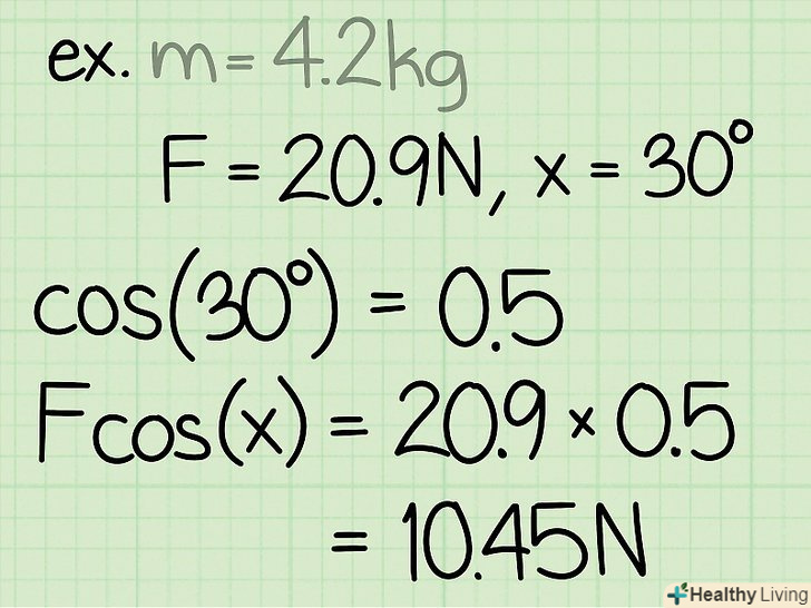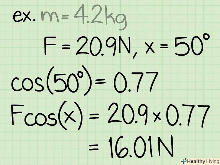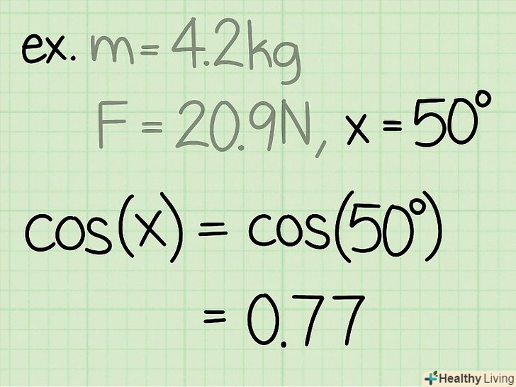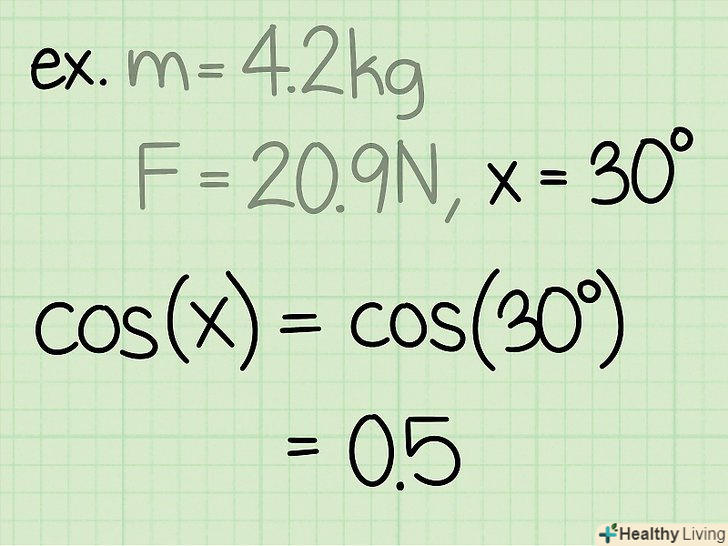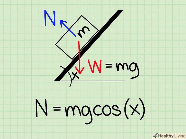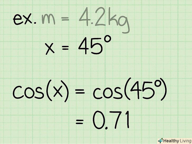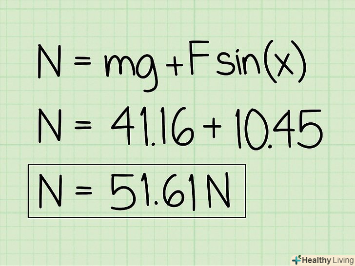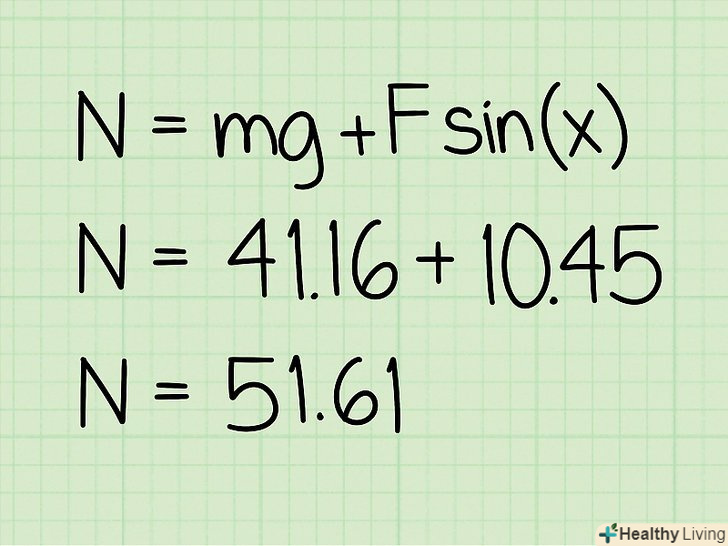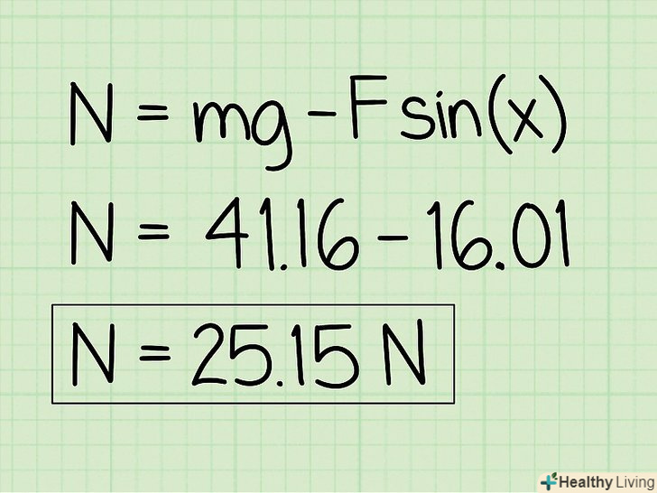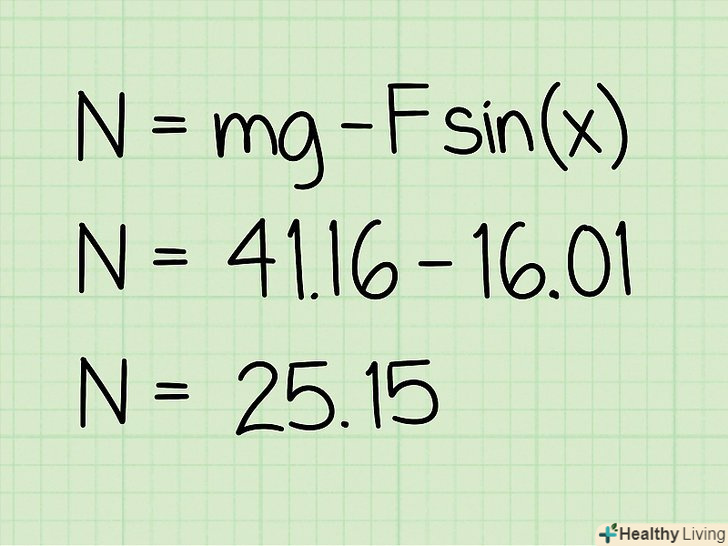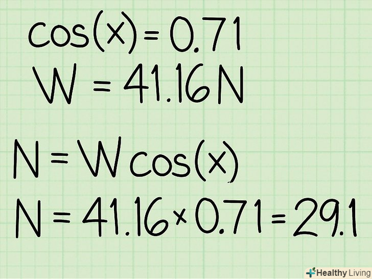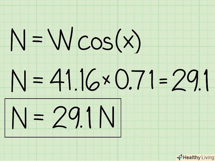 Перемножте два знайдених значення.для обчислення сили нормальної реакції помножте вагу на косинус кута нахилу.- Приклад: N = m * g * cos(x) = 41,16 * 0,71 = 29,1