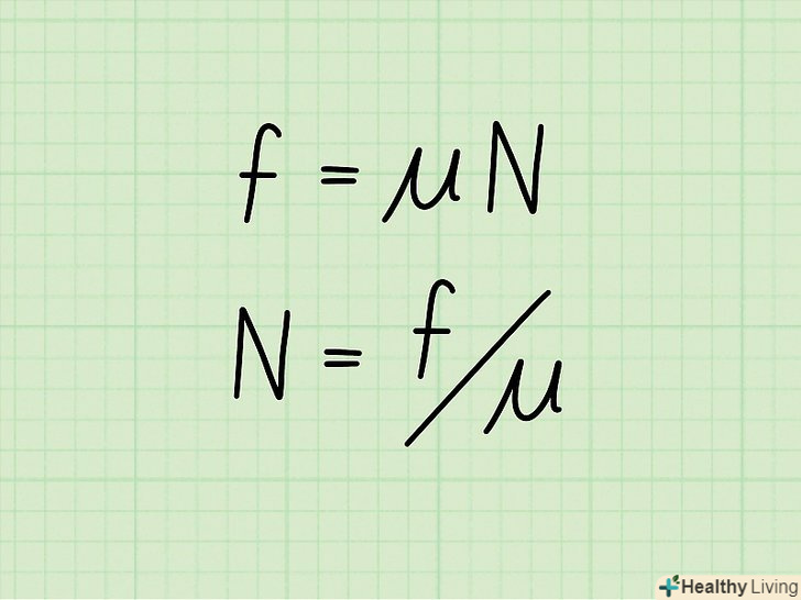 Перепишіть формулу, відокремивши силу нормальної реакції. якщо вам дано сила тертя і коефіцієнт тертя, ви можете знайти силу нормальної реакції за формулою: N = F / μ.- Обидві частини вихідної формули були розділені на μ, в результаті чого сила нормальної реакції була відокремлена на одній стороні, а сила тертя і коефіцієнт тертя - на іншій.