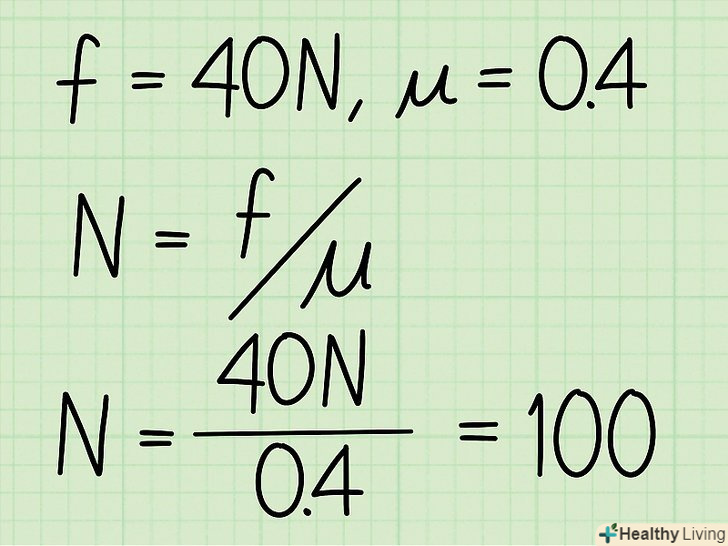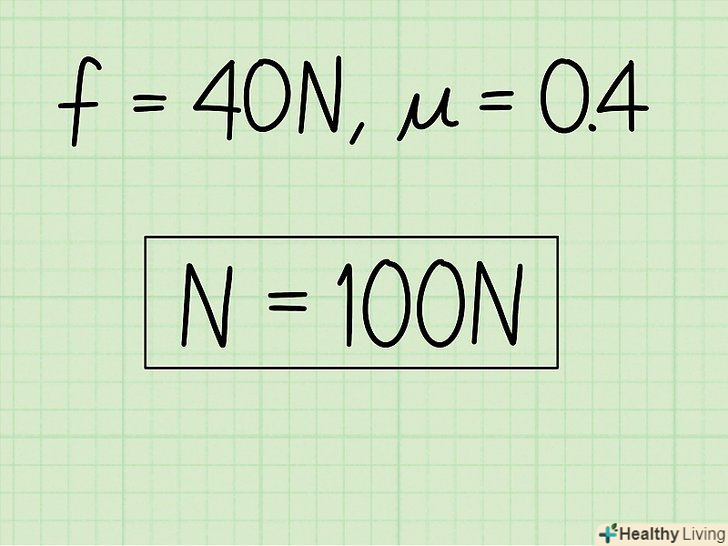 Запишіть відповідь. ви можете перевірити відповідь, підставивши його в вихідну формулу для обчислення сили тертя.- Приклад: сила нормальної реакції дорівнює 100 Н.