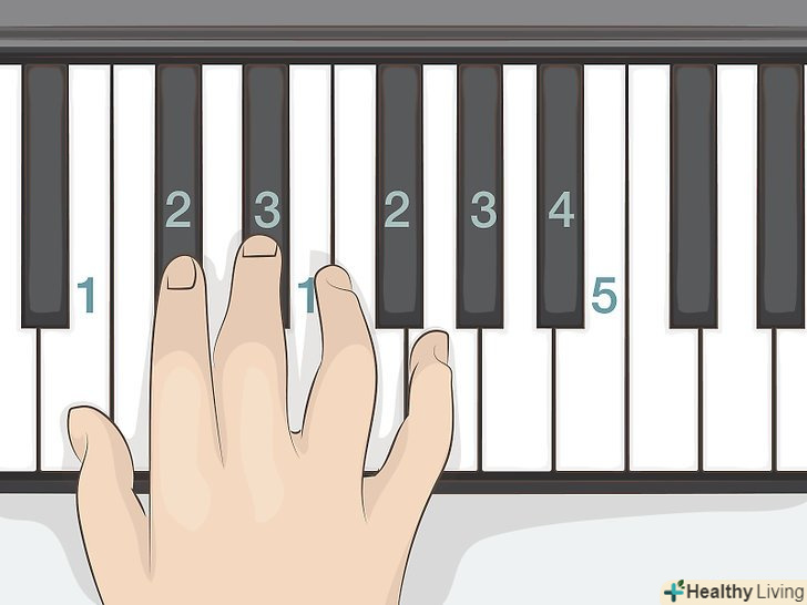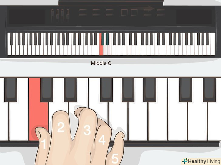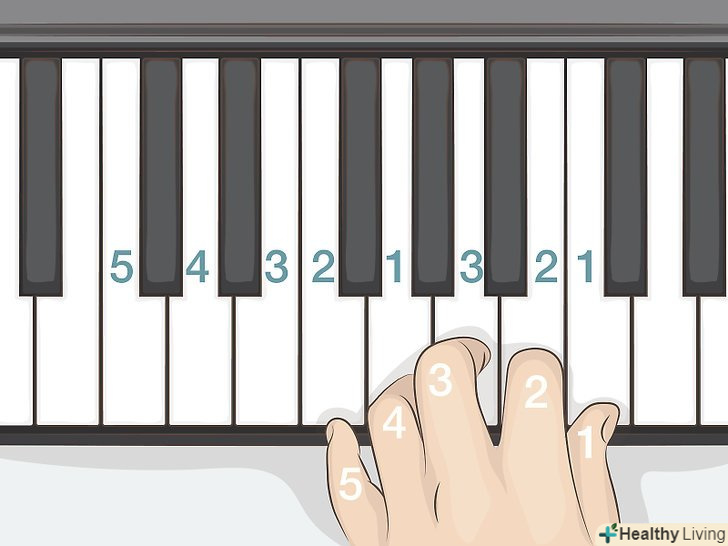 Знайдіть на клавіатурі центральну ноту "до".як для новачка, Центральна " до " буде служити для вас вихідною точкою відліку. Вона розташована прямо посередині клавіатури і представлена першою білою клавішею в групі з трьох білих клавіш з двома чорними клавішами в проміжках між ними. Встановіть великий палець правої руки на центральну "до", А потім послідовно розташуйте залишилися пальці на наступних білих клавішах справа.[8]- Натисніть великим пальцем на клавішу "до", щоб зіграти ноту. У нотах із зазначенням аплікатури пальців великому пальцю зазвичай присвоюється номер 1. Далі зіграйте ноту» ре " вказівним пальцем (йому відповідає позначення 2). Середній, або 3-й палець, повинен зіграти ноту «Мі», а безіменний, або 4 — й, - ноту «фа». Мізинцю, або 5-му пальцю, залишається нота «сіль». Це перші п'ять нот гами»до-мажор".