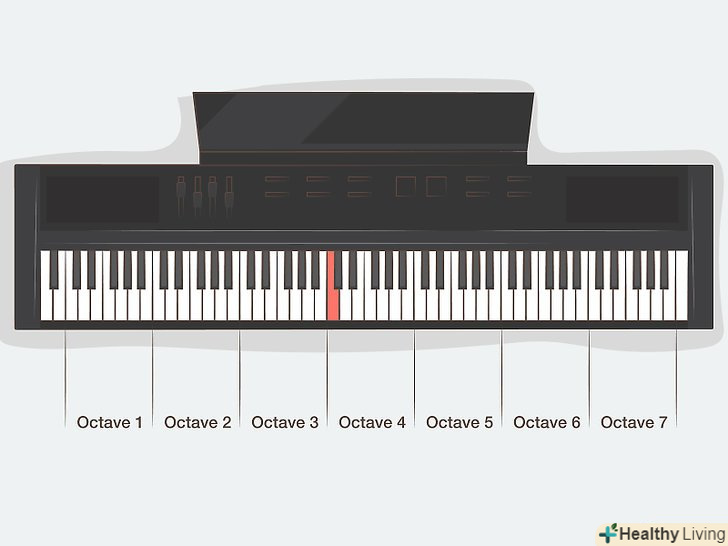 Вивчіть октави на клавіатурі фортепіано.перша октава розташовується там, де ви практикували гаму «до-мажор». Октава починається на ноті " до " і закінчується на ту ж ноту, але октавою вище. Якщо поглянути на клавіатуру, можна помітити, що на ній повторюється одна і та ж послідовність нот. Одні й ті ж 12 нот послідовно повторюються від одного кінця клавіатури, до іншого: це сім білих нотних клавіш («до», «ре», «мі», «фа», «сіль», «ля», «сі») і п'ять чорних («до-дієз»/«ре-мінор», «ре-дієз»/«мі-мінор», «фа-дієз»/«сіль-мінор», «сіль-дієз»/«ля-мінор» і «ля-дієз»/«сі-мінор»).[12]- Ноти різних октав мають однаковий тон, але різною висотою (яка може бути вище або нижче). Наприклад, можна зіграти гаму "до-мажор «від одного кінця клавіатури до іншого, починаючи з найнижчої» до" і закінчуючи найвищою. Те ж саме можна виконати і з іншими гамами.