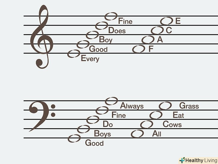 Засвойте основи читання нот з листа.для гри на фортепіано не обов'язково вміти читати ноти, адже навіть деякі з найбільших піаністів грали виключно на слух. Проте вміння читати ноти дає вам можливість швидше вивчити і почати виконувати помітно більшу кількість музичних творів.[13]- Музика записується на нотному стані з п'яти паралельних ліній (нотних лінійок) з чотирма проміжками між ними. Кожній лінії відповідає своя нота. Коли ви бачите нотну головку на конкретній лінії або в проміжку між ними, то граєте відповідну ноту. У скрипковому ключі безпосередньо на лініях розташовується п'ять нот в порядку знизу-вгору:» Мі«,» сіль«,» сі «першої октави, а також» ре «і» фа " другої октави. У проміжках між нотними лінійками розташовуються ноти "фа» і «ля» першої октави, а також «до» і" Мі " другої октави. Для швидкого запам'ятовування нот в скрипковому ключі використовуйте ключ в якості орієнтира, який також носить назву «ключ-сіль», так як його початковий кінець вказує на положення ноти «сіль» першої октави.