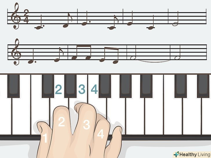 - Коли ви тільки починаєте розучувати мелодію, практикуйтеся кожною рукою окремо, а потім об'єднуйте їх, коли вже завчите виконання окремо. Спочатку налаштовуйте метроном на повільний темп. Збільшуйте швидкість тільки тоді, коли в повільному темпі вже будете грати без помилок.