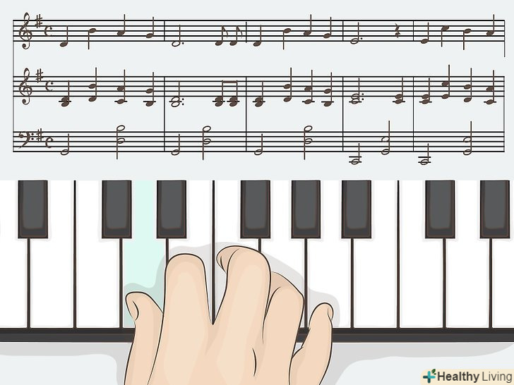 Вивчіть на фортепіано кілька простих мелодій, щоб краще познайомитися з інструментом.коли ви вже почнете комфортно працювати з клавіатурою інструменту і виконувати гами без помилок, можна буде перейти до виконання справжньої музики. Можна грати відносно прості мелодії або ж підшукати спрощене перекладення для новачків більш складної музики.[17]- Спробуйте знайти ноти для новачків, що включають в себе підписи нот поруч з їх символьним відображенням. Це допоможе вам почати легше читати ноти. Такі ноти можна знайти в нотних збірках для початківців, а також на деяких веб-сайтах і в додатках для смартфонів.