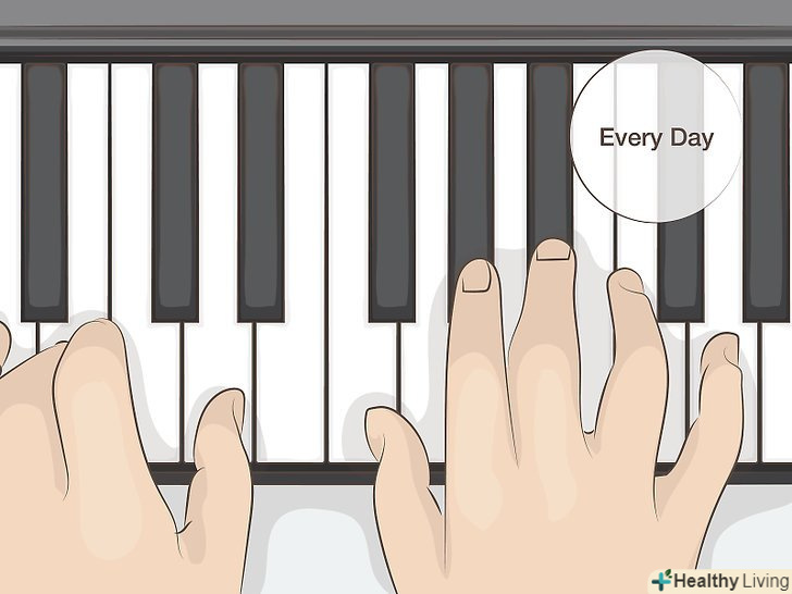 Зробіть звичкою щоденну практику гри на фортепіано.щоб вичавити максимум зі свого навчання і домогтися якнайшвидшого прогресу, важливо займатися щодня. Маленькі діти можуть практикуватися всього по 10-15 хвилин в день. Проте, якщо ви вже підліток або доросла людина, постарайтеся щодня приділяти практиці не менше 30 хвилин.[18]- Якщо у вас є можливість практикуватися кожен день в один і той же час, в кінці кінців, гра на піаніно стане одним зі звичних повсякденних занять поряд з чищенням зубів або прийомом душу. На цьому етапі ви вже не будете роздумувати про те,чи хочете ви займатися або не хочете, ви просто будете робити це.