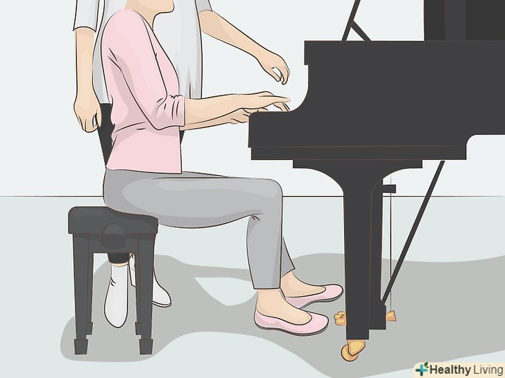 Найміть викладача гри на фортепіано, щоб вчитися під більш суворим керівництвом.робота з учителем дозволить прискорити прогрес навчання. Досвідчений викладач зверне вашу увагу на дрібні недоліки і виправить їх до того, як вони увійдуть у вас в звичку. Також вчитель буде додатково стимулювати і спонукати вас успішно вчитися.[20]- Непогано буде поспілкуватися з кількома викладачами, перш ніж ви зупините вибір на когось із них, особливо якщо мова йде про приватні уроки. Вам доведеться проводити багато часу з цією людиною, тому він повинен вам подобатися.