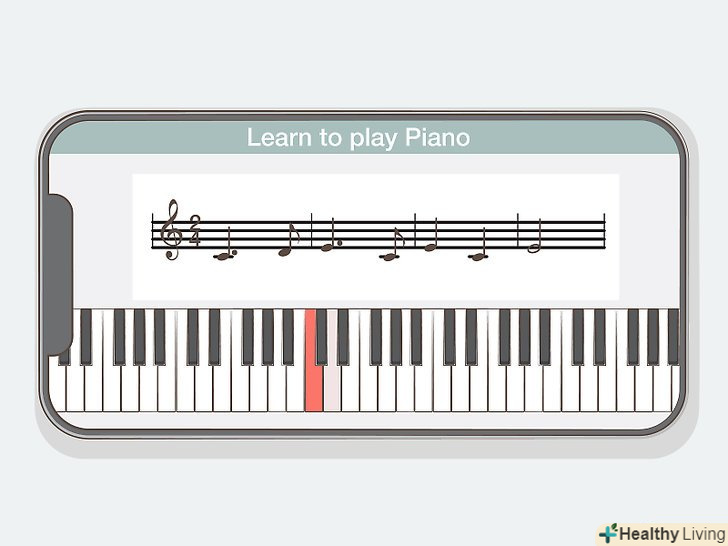 Спробуйте користуватися навчальним додатком для смартфона, якщо вчитеся грати на фортепіано самостійно.існує цілий ряд додатків, навчальних грі на фортепіано, які можна завантажити собі на смартфон або планшет. Деякі з них більш структуровані, ніж інші, тому, можливо, ви захочете випробувати відразу кілька, перш ніж вирішити, який додаток вам подобається найбільше.[21]- Більшість програм для навчання грі на фортепіано безкоштовні. Проте їх використання може бути обмежене, якщо не оплатити підписку. Наприклад, Додаток Yousician обмежено 20-ма хвилинами в день, якщо не підписатися на преміум.