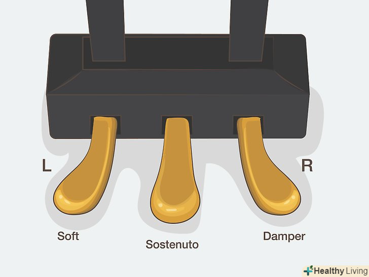 Почніть користуватисяПедалями, Якщо у вас акустичне фортепіано.акустичне фортепіано зазвичай оснащується трьома педалями. Пристрій педального механізму може бути різним, але найчастіше зліва-направо розташовуються наступні педалі: приглушує, затримує і демпферна і педалі. Щоб скористатися педаллю, натисніть на неї подушечкою стопи, утримуючи п'яту на підлозі.[22]- Демпферна (Права) педаль натискається правою ногою і не тільки гасить ноти, але дозволяє домогтися більш насиченого резонансу, ніж без застосування педалі. Коли педаль знаходиться в піднятому положенні, звук виходить більш плоским.