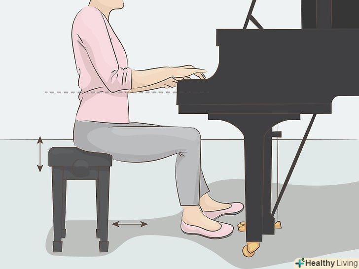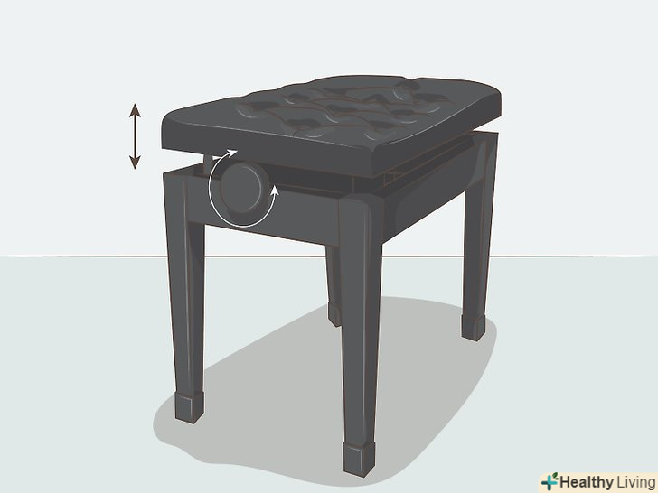 Витратьте на регульовану банкетку для фортепіано, якщо вона не йшла в комплекті з вашим інструментом.регульована банкетка дозволить вам завжди сидіти за фортепіано правильно, на потрібній висоті і з належною поставою. Якщо замість банкетки використовувати стілець, найімовірніше, вам не вдасться домогтися правильного положення за інструментом. Також у продажу можна знайти регульовані табурети для фортепіано, якщо вам не подобається варіант з банкеткою. Такі табурети частіше використовують з цифровими інструментами.[3]- Якщо ви придбали не акустичний інструмент, а цифрове фортепіано, для нього можна придбати спеціальну підставку, що забезпечує ту ж висоту, що і у акустичного піаніно. Також у продажу є регульовані по висоті підставки, які можна при необхідності складати і прибирати на зберігання, коли ви не граєте на інструменті.