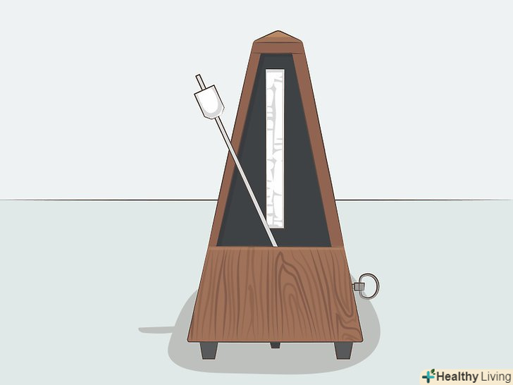 КупітьМетроном, щоб під час гри на інструменті тримати необхідний темп.метроном видає розмірені клацання, які допомагають виконувати музику в постійному темпі. Придбати метроном можна онлайн або в місцевому музичному магазині. Також існують спеціальні додатки для смартфонів, які можна завантажити і використовувати в якості цифрового метронома.[5]- У багатьох цифрових фортепіано присутній вбудований метроном.