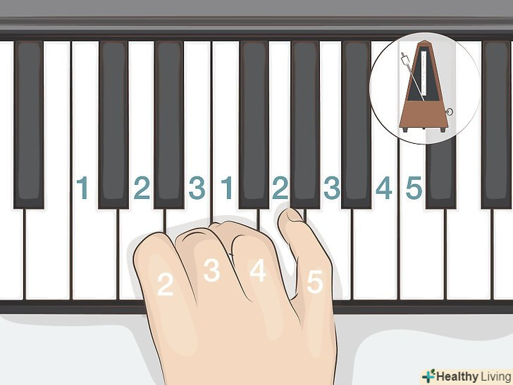 Запустіть метроном і почніть практикувати виконання гами «до-мажор». щоб повністю озвучити гаму, почніть з перших трьох нот, які ви зіграли, коли знайшли центральну ноту "до «(тобто» до«,» ре«,»мі"). Потім, замість того щоб зіграти «фа» безіменним пальцем, заведіть великий палець під інші пальці і, щоб дотягнутися їм до Ноти «фа», трохи опустіть руку. Одночасно з цим інші пальці повинні зміститися на наступні ноти гами: «сіль», «ля», «сі» і знову «до», але вже на октаву вище.[9]- Починайте практикуватися з метрономом у відносно повільному темпі і продовжуйте виконувати гаму, поки не навчитеся грати її гладко, переміщаючи руку по клавішах і натискаючи ноти в правильному порядку, не здійснюючи ніяких помилок і не поглядаючи на клавіатуру. Потім трохи збільште темп метронома і спробуйте знову.