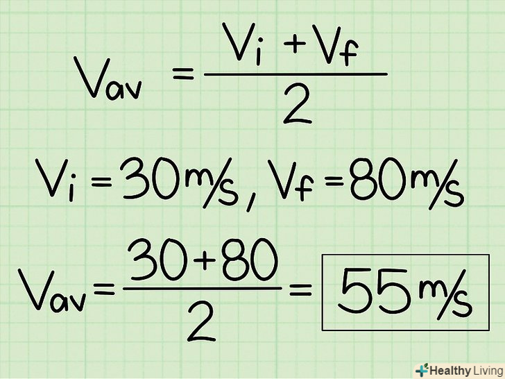 Обчисліть середню швидкість, коли прискорення постійне. для цього скористайтеся наступною формулою: [2]. У цій формулі