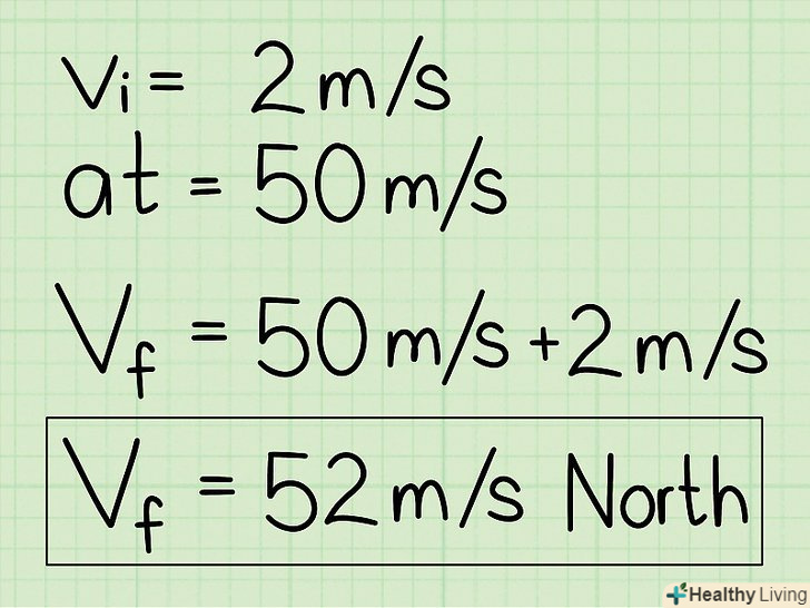 Вкажіть напрямок руху. Пам'ятайте, що швидкість є векторною величиною, тобто має напрямок. Тому у відповіді вкажіть напрямок.- У нашому прикладі човен почав рух на північ і не змінив напрямок, тому його кінцева швидкість дорівнює 52 м/с на північ.