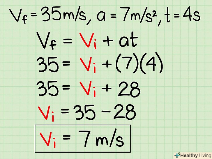 Використовуйте цю формулу, щоб обчислити інші величини, які входять в неї. якщо відомі прискорення і швидкість в певний момент часу, за допомогою формули можна знайти швидкість в інший момент часу. Наприклад, обчислимо початкову швидкість:- Поїзд прискорюється на 7 м / с 2