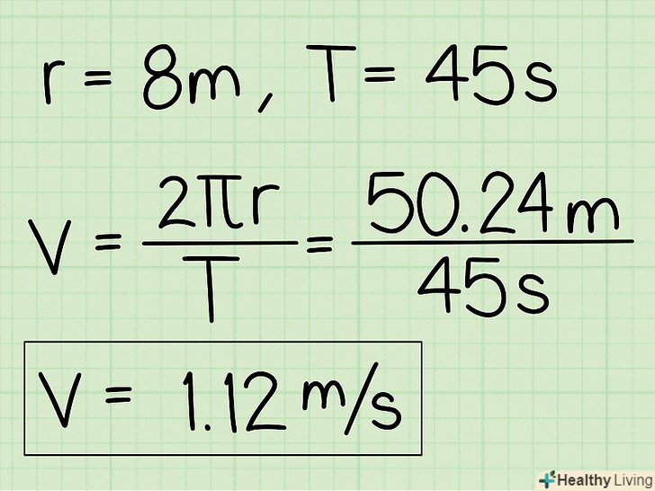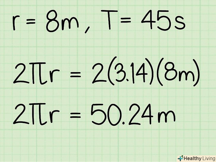 Помножте радіус кола на 2π. спочатку необхідно обчислити довжину кола. Для цього помножте радіус на 2π. Як значення π можна використовувати 3, 14.- Приклад: знайдіть кругову швидкість тіла, що рухається по круговій траєкторії з радіусом 8 м протягом 45 С.