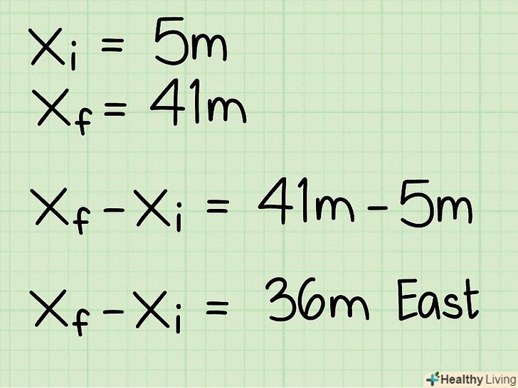 Обчисліть відстань між початковим і кінцевим положеннями. тобто між точками початку і закінчення руху; вони, поряд з напрямком руху, вказують на «переміщення» або «зміна положення». [3] при цьому траєкторія руху тіла між цими точками значення не має.- Приклад 1: автомобіль, що їде на схід, починає рух в положенні x = 5 м. через 8 с машина знаходиться в положенні х = 41 м. яке переміщення автомобіля?