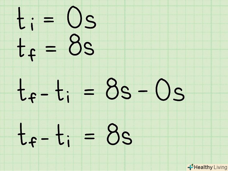 Обчисліть зміну часу. час, який потрібен для досягнення кінцевої точки, буде, швидше за все, дано в завданні; якщо ні, просто відніміть початковий час з кінцевого.- Приклад 1 (продовження): у завданні сказано, що машині потрібно 8 с, щоб переміститися з початкової точки в кінцеву, тому зміна часу дорівнює 8 с.