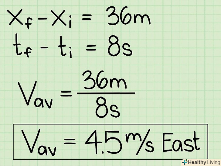 Розділіть переміщення на зміну часу. зробіть це, щоб знайти швидкість рухомого тіла. Тепер вкажіть напрямок руху, і ви отримаєте середню швидкість.- Приклад 1 (продовження): автомобіль перемістився на 36 м за 8 с.