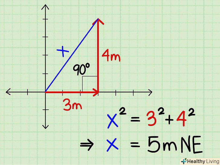 - Намалюйте схему і з'єднайте початкову і кінцеву точки прямою лінією. Це гіпотенуза трикутника, яку можна знайти за допомогою теореми Піфагора або інших формул . У нашому прикладі переміщення складе 5 м на північний схід.