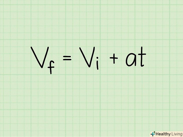 Запам'ятайте формулу для обчислення швидкості прискорюється тіла. прискорення-це швидкість зміни швидкості. Якщо прискорення постійне, швидкість змінюється з однаковою швидкістю. [5] Формула включає добуток прискорення і часу, а також початкову швидкість:або " кінцева швидкість = початкова швидкість + (прискорення * час)»