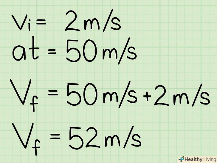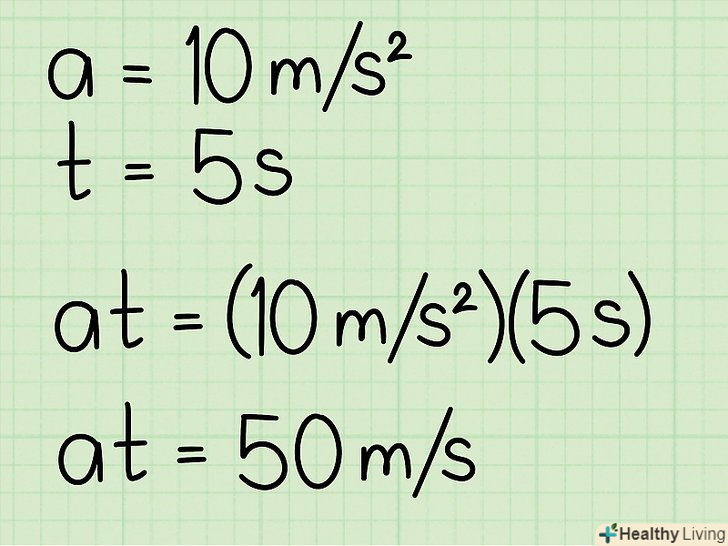 - Метри в секунду — м / с) - це одиниця виміру швидкості. [7] . Перед вирішенням завдання переконайтеся, що всі одиниці виміру відповідають один одному, наприклад, Значення дані в метрах (м), секундах (с), метрах в секунду (м/с) І метрах в квадратних секундах (м / с 2 ).