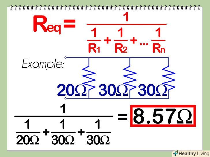 Req = 1/{(1/R1)+(1/R2)+(1/R3)..+(1/Rn)} де n — Загальна кількість резисторів в ланцюзі, з'єднаних паралельно.[4] - Припустимо, дані резистори з опорами R1 = 20 Ом, R2 = 30 Ом, and R3 = 30 Ом.