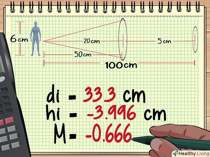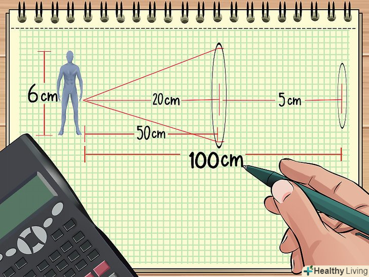 Знайдіть відстань між лінзами і предметом.якщо перед предметом розташовані дві лінзи, можна обчислити збільшення кінцевого зображення, знаючи відстані від предмета до лінз, висоту предмета і фокусні відстані обох лінз.- Розглянемо попередній приклад-фігурку висотою 6 см, яка знаходиться на відстані 50 см від збирає лінзи з фокусною відстанню 20 см і на відстані 100 см від другої лінзи з фокусною відстанню 5 см.знайдіть збільшення такої системи лінз.