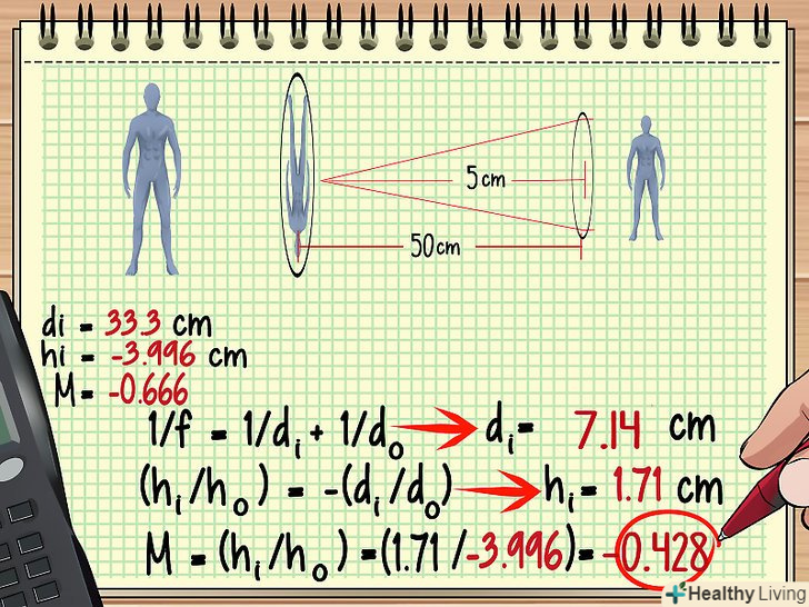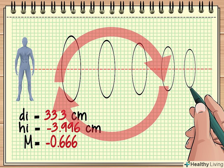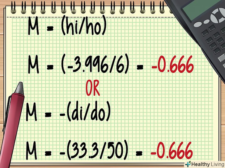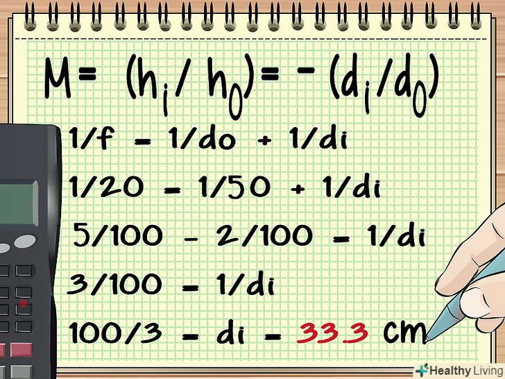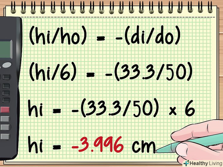 Тепер Ви знаєте do і di і можете знайти висоту збільшеного зображення і збільшення лінзи. зверніть увагу, що формула для обчислення збільшення включає два знаки рівності (M = (hi/ho) = -(dI/do)), тобто обидва відносини рівні, і ви можете скористатися цим фактом при обчисленні M і hi.- У нашому прикладі знайдіть hi наступним чином: