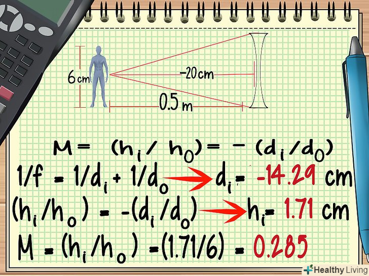 У разі розсіює лінзи використовуйте негативне значення фокусної відстані. це єдина відмінність обчислення збільшення розсіює лінзи від обчислення збільшення збирає лінзи (всі формули залишаються тими ж). У нашому прикладі цей факт вплине на Значення di.- Виконаємо обчислення для нашого прикладу ще раз, але за умови, що ми використовуємо розсіює лінзу з фокусною відстанню -20 см.всі інші значеннями залишаються такими ж.