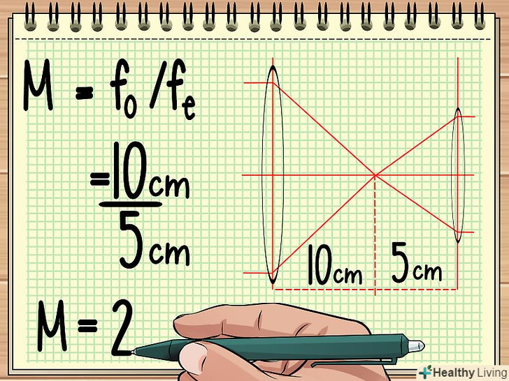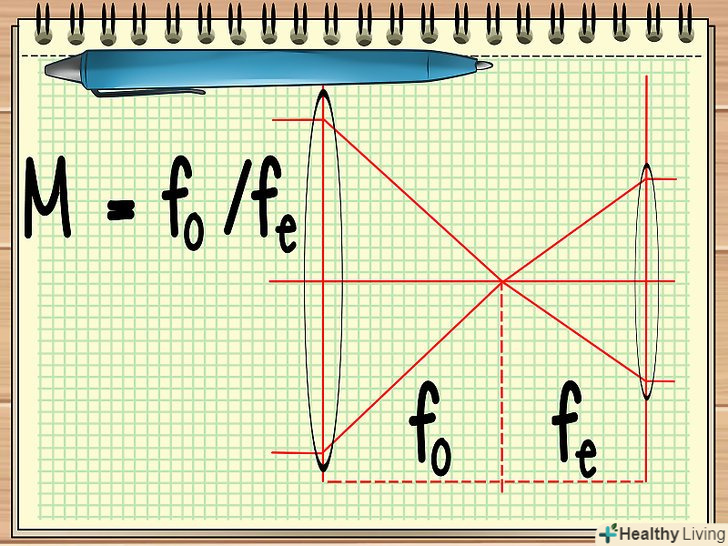 Знайдіть фокусну відстань обох лінз. коли ви маєте справу з системою, що складається з двох лінз, які розташовані паралельно один одному (наприклад, як в телескопі), вам потрібно визначити фокусну відстань обох лінз, щоб знайти збільшення такої системи. Це можна зробити за формулою M = fo / fe.[4]- У формулі fo - це фокусна відстань лінзи об'єктива, fo - це фокусна відстань лінзи окуляра (до окуляра ви прикладаєте очей).
