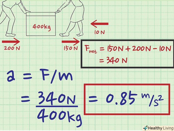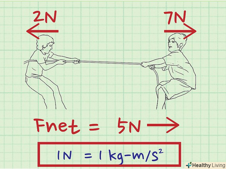 Знайдіть результуючу силу, що діє на тіло.результуюча сила не врівноважується іншими силами. Якщо на тіло діють дві різноспрямовані сили, причому одна з них більше іншої, то напрямок результуючої сили збігається з напрямком більшої сили.[7] прискорення виникає тоді, коли на тіло діє сила, яка не врівноважена іншими силами і яка призводить до зміни швидкості тіла в напрямку дії цієї сили.- Наприклад, ви з братом перетягуєте канат. Ви тягнете канат з силою 5 Н, а ваш брат тягне канат (в протилежному напрямку) з силою 7 Н. результуюча сила дорівнює 2 Н і спрямована в бік вашого брата.
