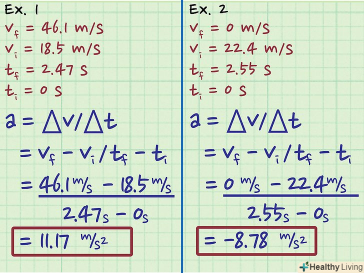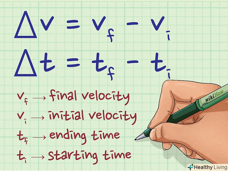 Визначення змінних. ви можете обчислити Δv і Δt наступним чином: Δv = vдо - vн і Δt = tдо - tн, де vдо – кінцева швидкість, vн – початкова швидкість, tдо – кінцевий час, tн – початковий час.[5]- Так як прискорення має напрямок, завжди віднімайте початкову швидкість з кінцевої швидкості; в противно випадку напрямок обчисленого прискорення буде невірним.