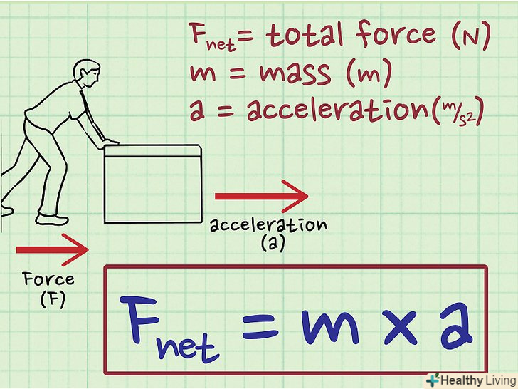 Другий закон Ньютона.відповідно до другого закону Ньютона тіло буде прискорюватися, якщо сили, що діють на нього, не врівноважують один одного. Таке прискорення залежить від результуючої сили, що діє на тіло.[6] використовуючи другий закон Ньютона, ви можете знайти прискорення тіла, якщо вам відома його маса і сила, що діє на це тіло.- Другий закон Ньютона описується формулою:Fрез = m x a, де Fрез - результуюча сила, що діє на тіло, m - маса тіла, a - прискорення тіла.