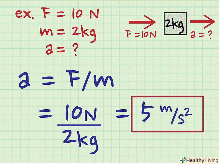 - Працюючи з цією формулою, використовуйте одиниці виміру метричної системи, в якій маса вимірюється в кілограмах (кг), сила в ньютонах (Н), а прискорення в метрах в секунду за секунду (м/с2).