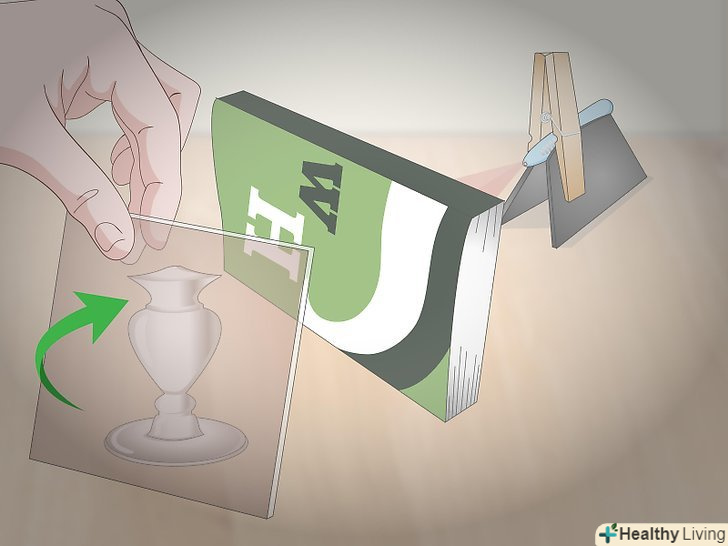 Притуліть до об'єкта зйомки голографічну пластину.дістаньте голографічну пластинку з коробки і обережно обіпріть її про знімається предмет. Якщо пластина недостатньо товста і не тримається вертикально, підіпріть її пластиковими підставками з обох сторін.[9]- Дайте голографічній пластині постояти 10-20 секунд, перш ніж почати процес зйомки.