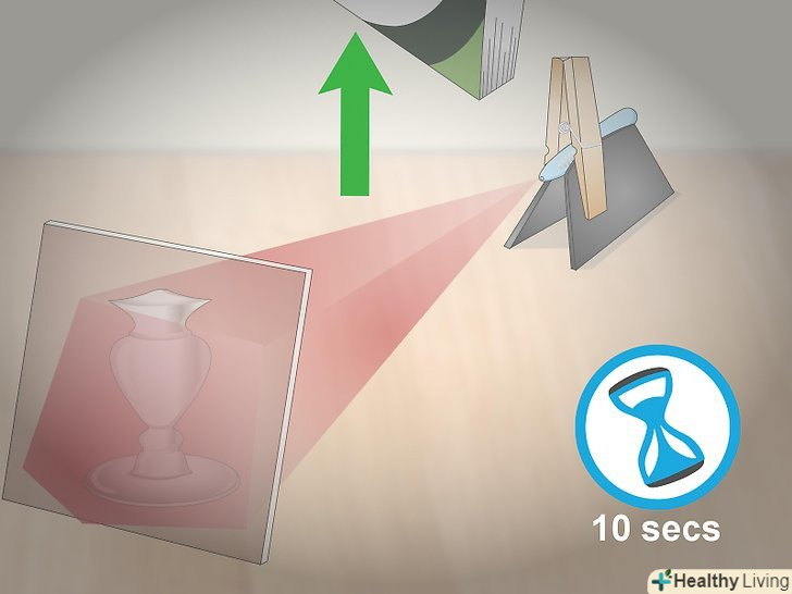 Приберіть блокуючий предмет зі шляху променя приблизно на 10 секунд.На 10 секунд повністю підніміть книгу, щоб промінь лазера падав на голографічну пластинку. Через 10 секунд знову опустіть книгу і перекрийте лазерний промінь.[11]