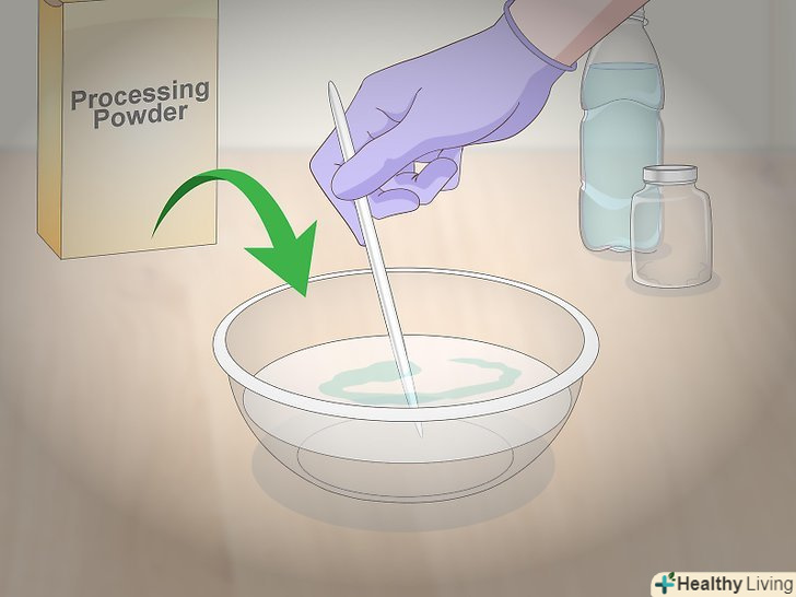 Змішайте хімічні реактиви відповідно до прикладених до набору вказівками.розбавте порошки з набору в мисках. Відповідно до вказівок щодо застосування розведіть необхідну кількість порошків водою в окремих мисках і як слід перемішайте їх тонким металевим предметом.[12]- Не змішуйте окремі розчини разом, якщо тільки це не вказано на упаковці. Уважно дотримуйтесь прикладені інструкції, щоб не сталося ніяких інцидентів.