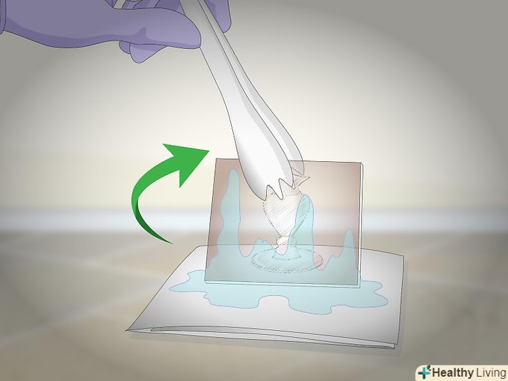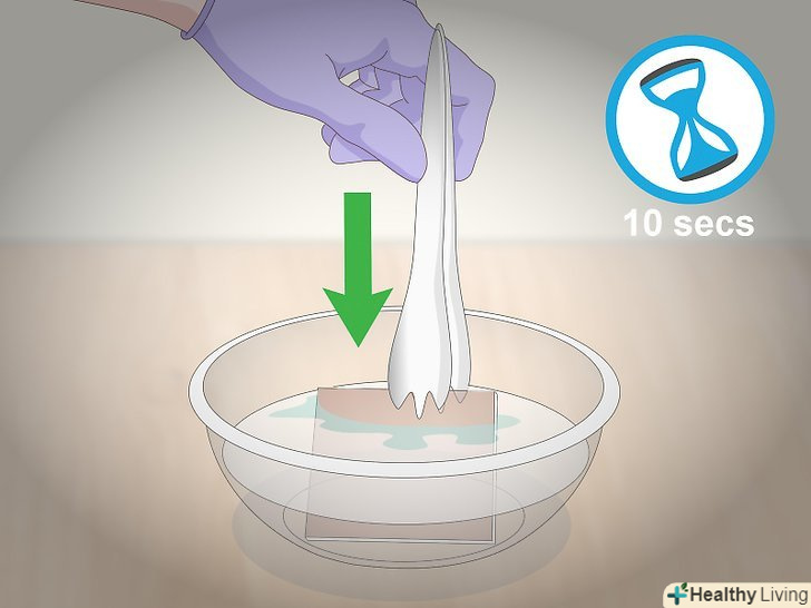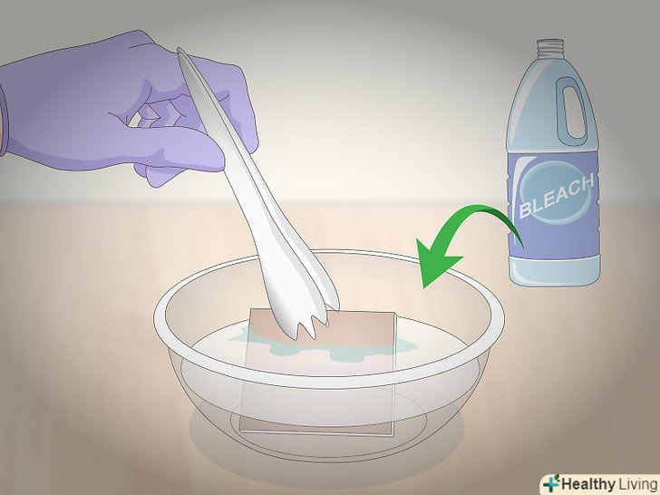 Виконайте те ж саме з відбілюючим розчином.захопіть пластинку металевими щипцями, занурте в розчин відбілювача і не поспішаючи поводите нею вперед і назад. Через 20 секунд дістаньте пластинку і промивайте її в злегка теплій воді близько 30 секунд.[14]- Якщо в інструкціях не сказано інакше, після проявника і відбілювача пластинку можна промивати в одній і тій же мисці з водою.