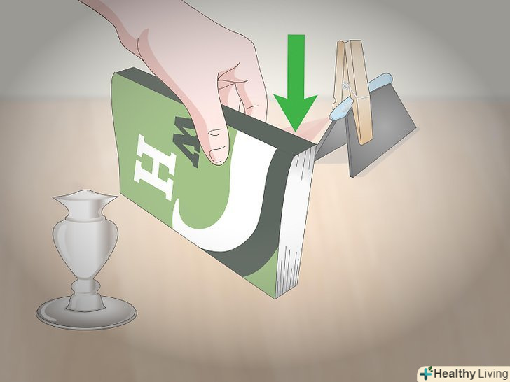 На час заблокуйте лазерний промінь книгою або іншим предметом.поставте між лазером і об'єктом зйомки книгу в твердій палітурці або інший великий і плоский предмет, щоб перекрити промінь. Цей предмет послужить подобою "заслінки" при зйомці об'єкта.[8]- Якщо ви використовуєте замість книги щось інше, виберіть повністю непрозорий предмет. Якщо він буде хоча б частково пропускати світло, то не зможе як слід блокувати промінь указки.