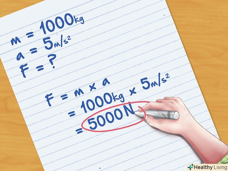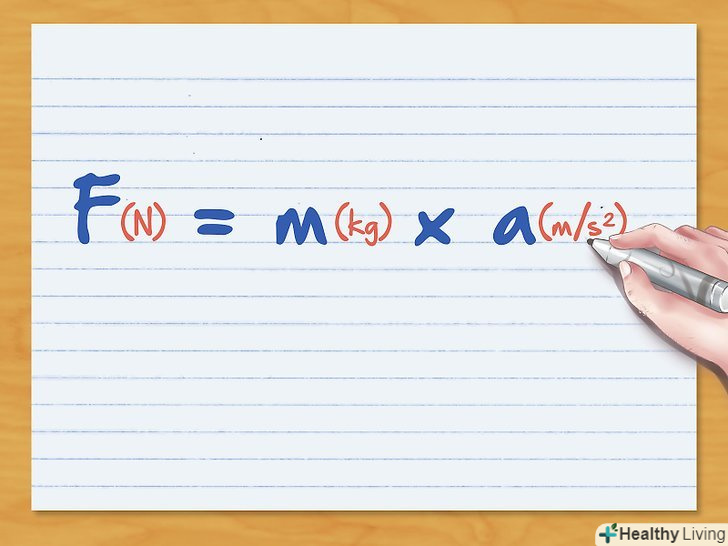 Помножте масу на прискорення. Сила F, необхідна для того, щоб надати об'єкту масою m прискорення a, визначається за такою формулою: F = m x a. тобто сила дорівнює масі, помноженій на прискорення.[1]