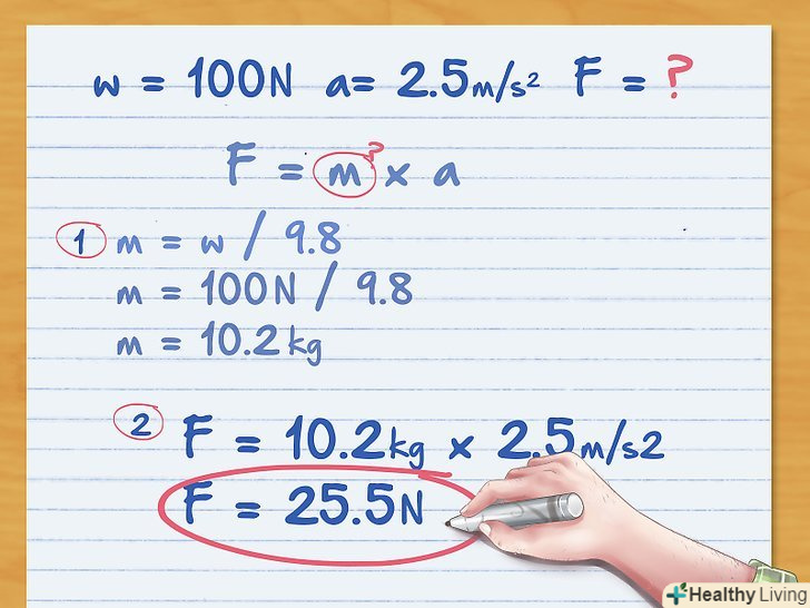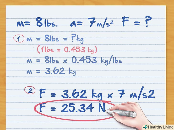 Переведіть одиниці виміру в систему СІ.у міжнародній системі одиниць (СІ) основною одиницею вимірювання маси служить кілограм, а прискорення – м/с2 (метр на секунду в квадраті). Висловивши масу і прискорення в одиницях СІ, ми отримаємо значення сили в ньютонах (Н).- Наприклад, якщо маса об'єкта становить 3 фунта, необхідноперевести її в кілограми. 3 фунти дорівнюють 1,36 кілограмам, тобто маса об'єкта дорівнює 1,36 кг.