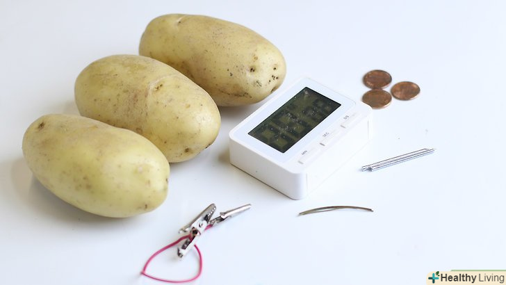 Почніть з підготовки матеріалів.як і в більшості експериментів, вам слід почати роботу з підготовки матеріалів, які знадобляться для роботи. Більшу частину з них можна придбати в господарському магазині, а деякі матеріали вже можуть бути у вас вдома. Приготуйте наступне:[6]- 3 картоплини;