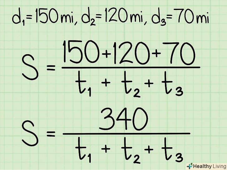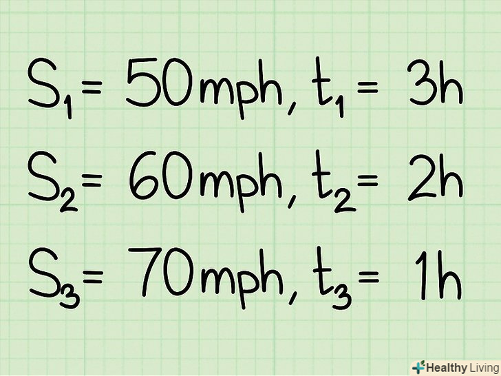 Обчисліть загальний шлях.для цього помножте кожну швидкість на відповідний час. Так ви знайдете довжину кожної ділянки шляху. Щоб обчислити загальний шлях, складіть значення пройдених ділянок шляху. У формулу підставте загальний пройдений шлях (замість).
