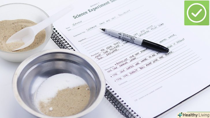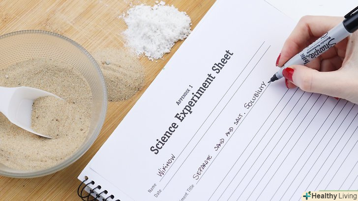 Опишіть завдання експерименту. [8] цілі експериментів часто цілком очевидні, але коли ви будете проводити експеримент, вам не завадить позначити для себе конкретну мету. В даному випадку ви бажаєте продемонструвати концепцію розчинності. Термін "розчинність" означає здатність речовини повністю розчинятися в рідині.[9]- Хоча в експерименті з сіллю і піском немає нічого складного, ви незабаром виявите, що отримуєте величезне задоволення від ведення записів.