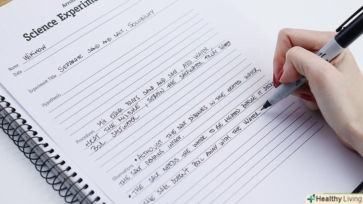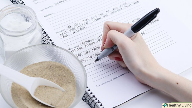 Проведіть спостереження. експеримент-ніщо без критичної оцінки. Звичка ведення записів під час проведення експериментів значно збагатить ваш досвід. Ви помітите деталі, які інакше б пропустили. Записуйте навіть найочевидніші спостереження. Їх можна буде осмислити по закінченню експерименту. Слідкуйте за основними моментами і змінами в експерименті. Зверніть увагу на наступне:[10]- Незважаючи на те, що сіль розчиняється в нагрітій воді, структурно вона залишається колишньою.