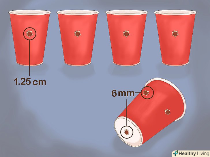 Виконайте отвори в маленьких паперових стаканчиках.візьміть чотири маленьких паперових стаканчика, і в кожному з них виконайте одиничний отвір на відстані 1,25 см нижче обода. Візьміть п'ятий келих і проколіть чотири рівномірно розташованих отвори, приблизно на відстані 6 мм нижче обода, а п'ятий отвір зробіть в центрі денця.- Якщо під рукою немає нічого гострого, то дірки можна виконати і олівцем.