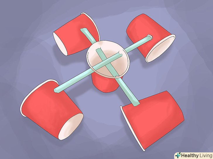 Застроміть пластикову соломинку на 2.5 см в стаканчик з одиничним отвором.другий кінець соломки протягніть через два отвори в чашці з п'ятьма отворами. Вставте вільний кінець соломки в іншу чашку з одним отвором. Поверніть стаканчики з одиничними отворами, нанизані на одну і ту ж соломинку так, щоб вони розташувалися в протилежних напрямках. Степлером прикріпіть соломинки до склянок.